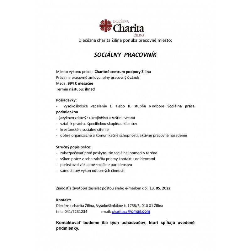 Miesto výkonu práce: Charitné centrum podpory Žilina