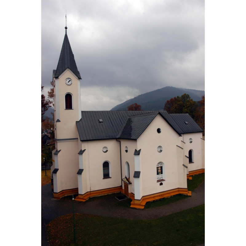 Jednoloďový neogotický chrám je postavený na pôdoryse obráteného kríža. Hlavné rameno je dlhé 28 metrov, priečne rameno je široké 20 metrov. Chrám je zasvätený Narodeniu Panny Márie. Na hlavnom oltári, ktorý má tri výklenky, stojí v prostrednom socha Panny Márie, ktorú vyhotovil neznámy rezbár okolo roku 1498. Socha je vysoká 145 cm. V bočných výklenkoch sú sochy anjelov. V bočných ramenách kostola je napravo oltár sv. Jozefa a naľavo je oltár sv. Anny. Na strope chrámu sú maľby, ktoré znázorňujú tajomstvá posv. ruženca. Hranolová veža má ihlanovú strechu, vo veži sú štyri zvony a zvonkohra.